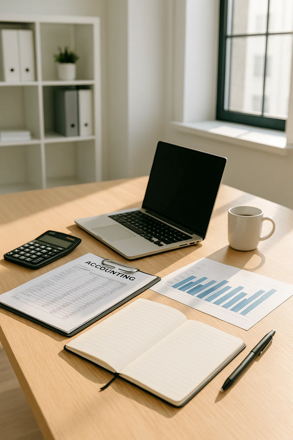 ✅ 연말결산 | "정리된 책상 위에 재무제표, 캘린더, 전자계산기, 따뜻한 오피스 조명, 안정감 있는 톤" |